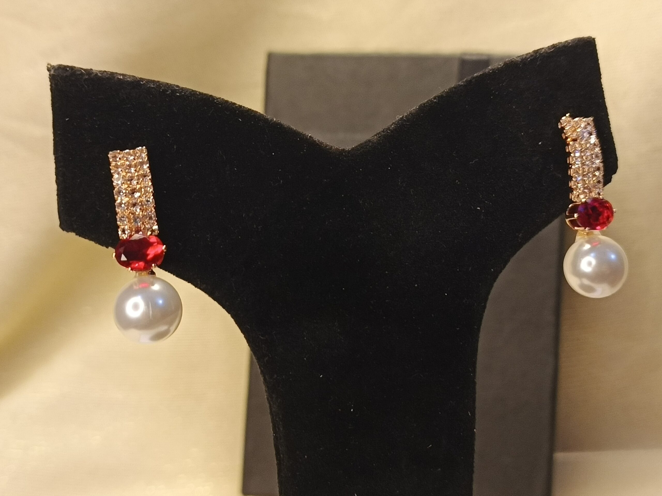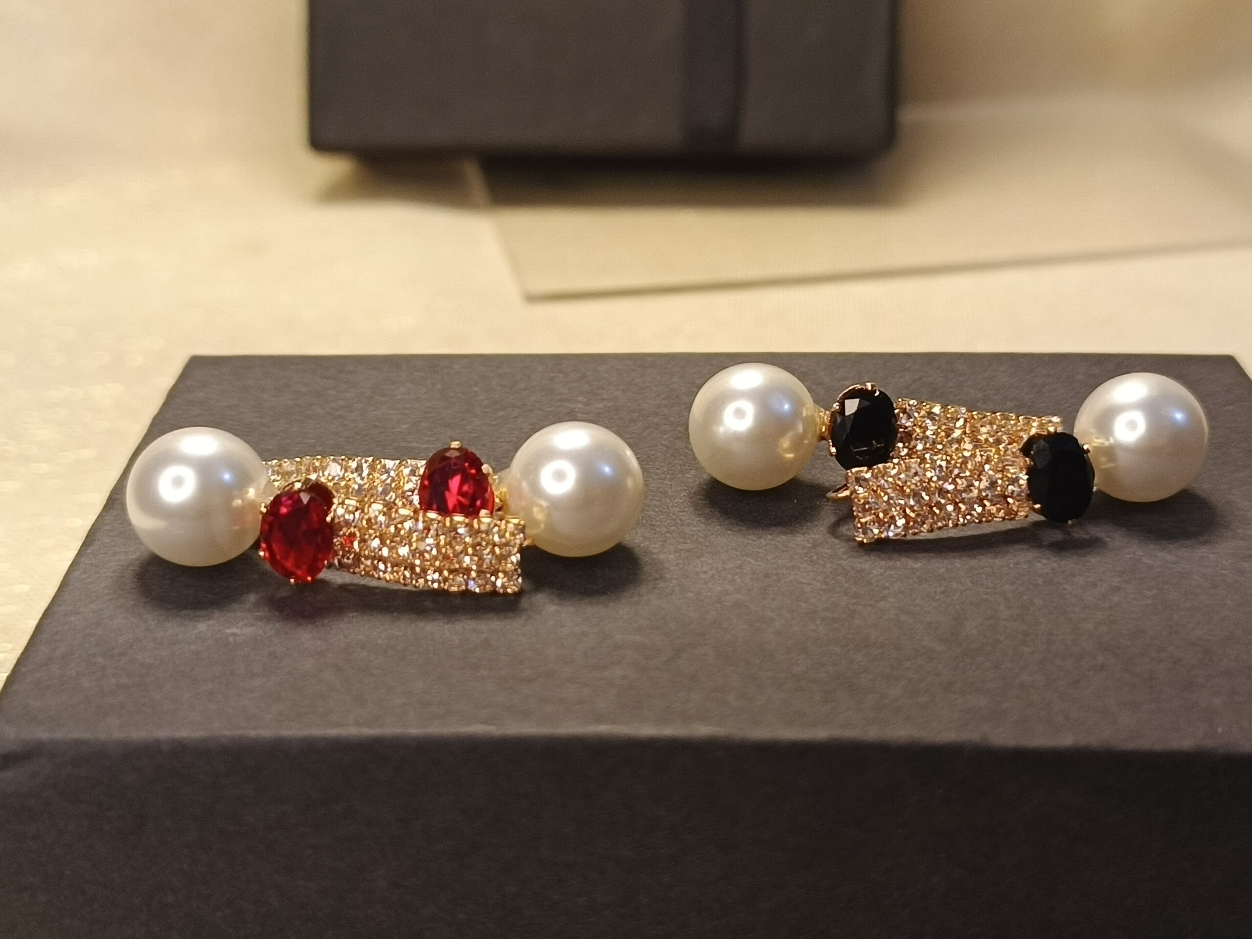 Timeless elegance meets modern sparkle in these stunning crystal and pearl stud earrings, available in two striking variants – radiant red and classic black.