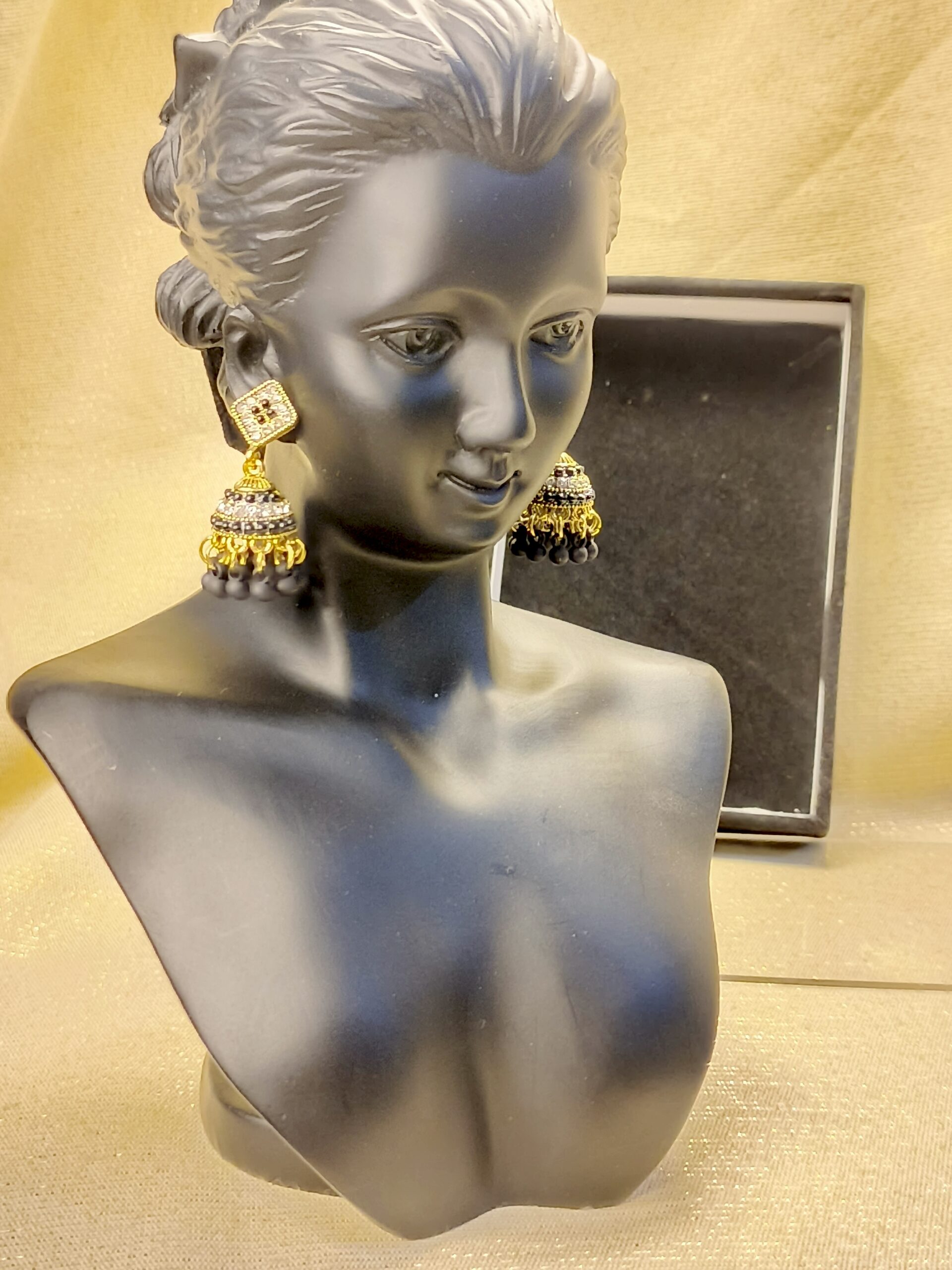 Add a regal touch to your jewelry collection with these Royal Gold & Black Jhumka Earrings. Designed with intricate detailing, the earrings feature a diamond-shaped stud encrusted with sparkling black and white stones, leading to an exquisitely crafted dome adorned with layers of shimmering accents. The hanging black beads add a graceful movement, making these earrings a perfect choice for festive occasions, weddings, and ethnic outfits.