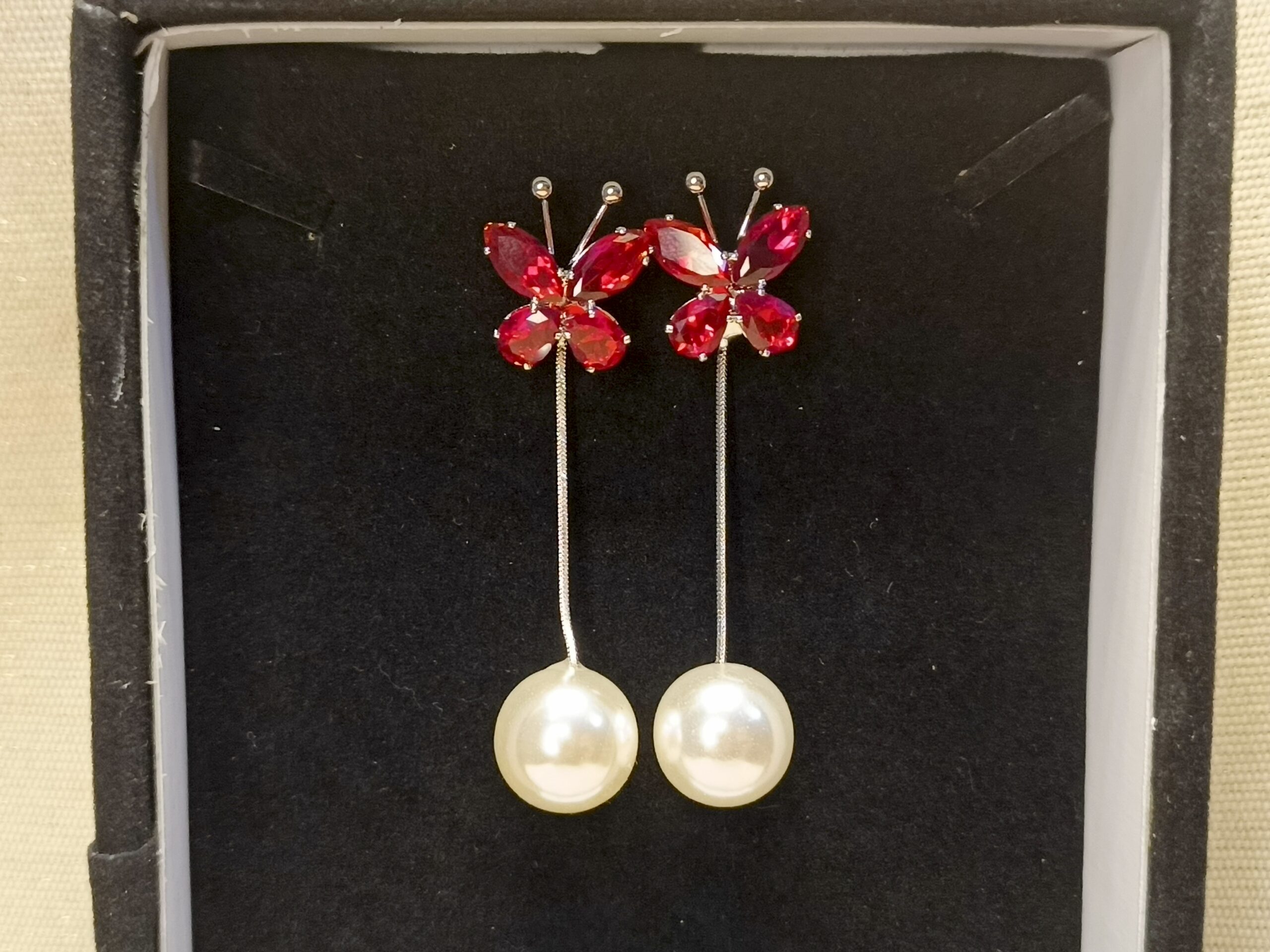 Delicate yet bold, the Ruby Butterfly Pearl Drop Earrings bring a touch of enchantment to your jewelry collection. The intricately designed butterflies sparkle with rich red crystals, symbolizing passion and transformation. Set in a sleek silver-tone finish, these vibrant butterflies sit atop fine, flexible chains that lead to lustrous pearl drops, adding timeless sophistication.