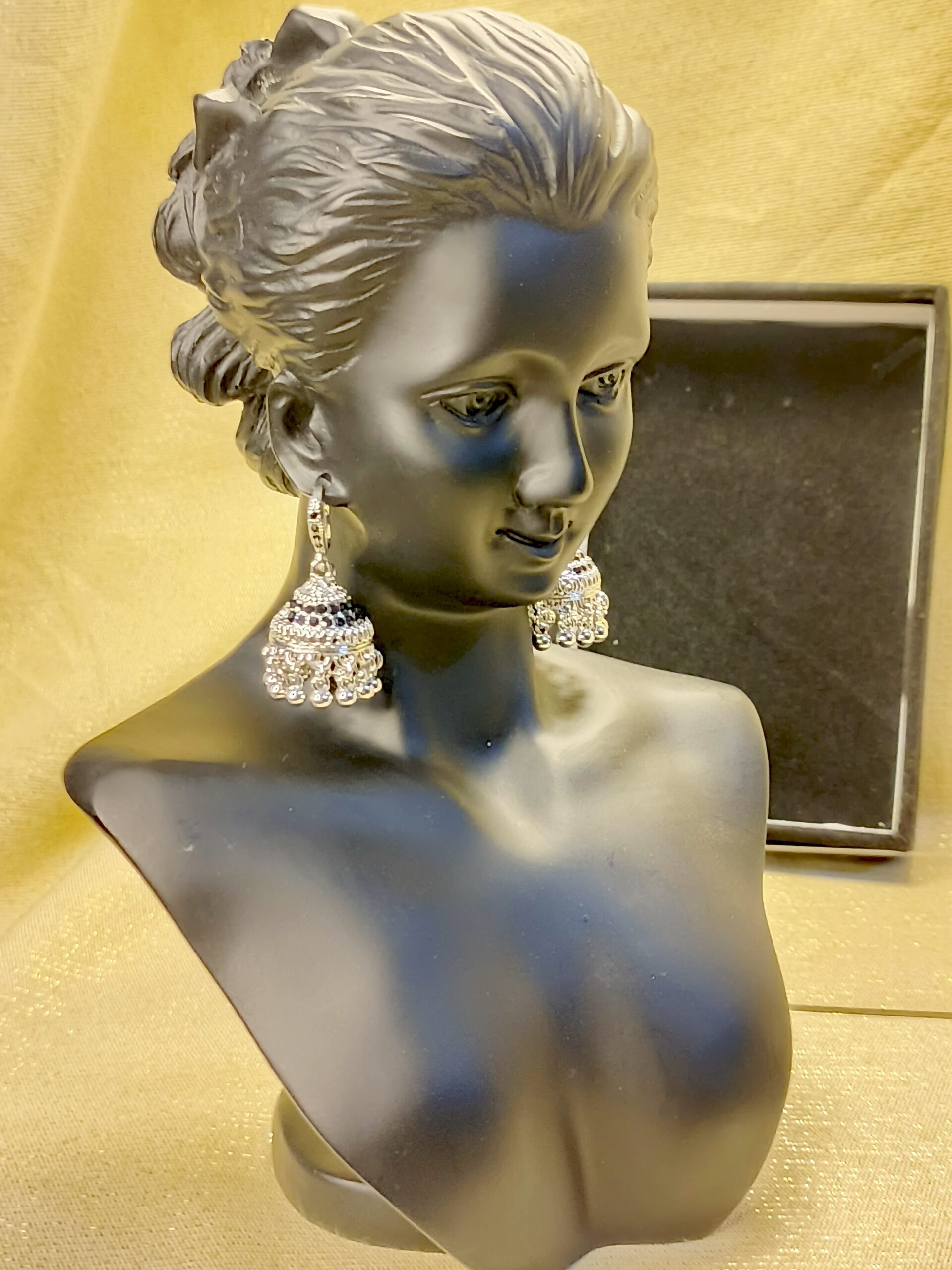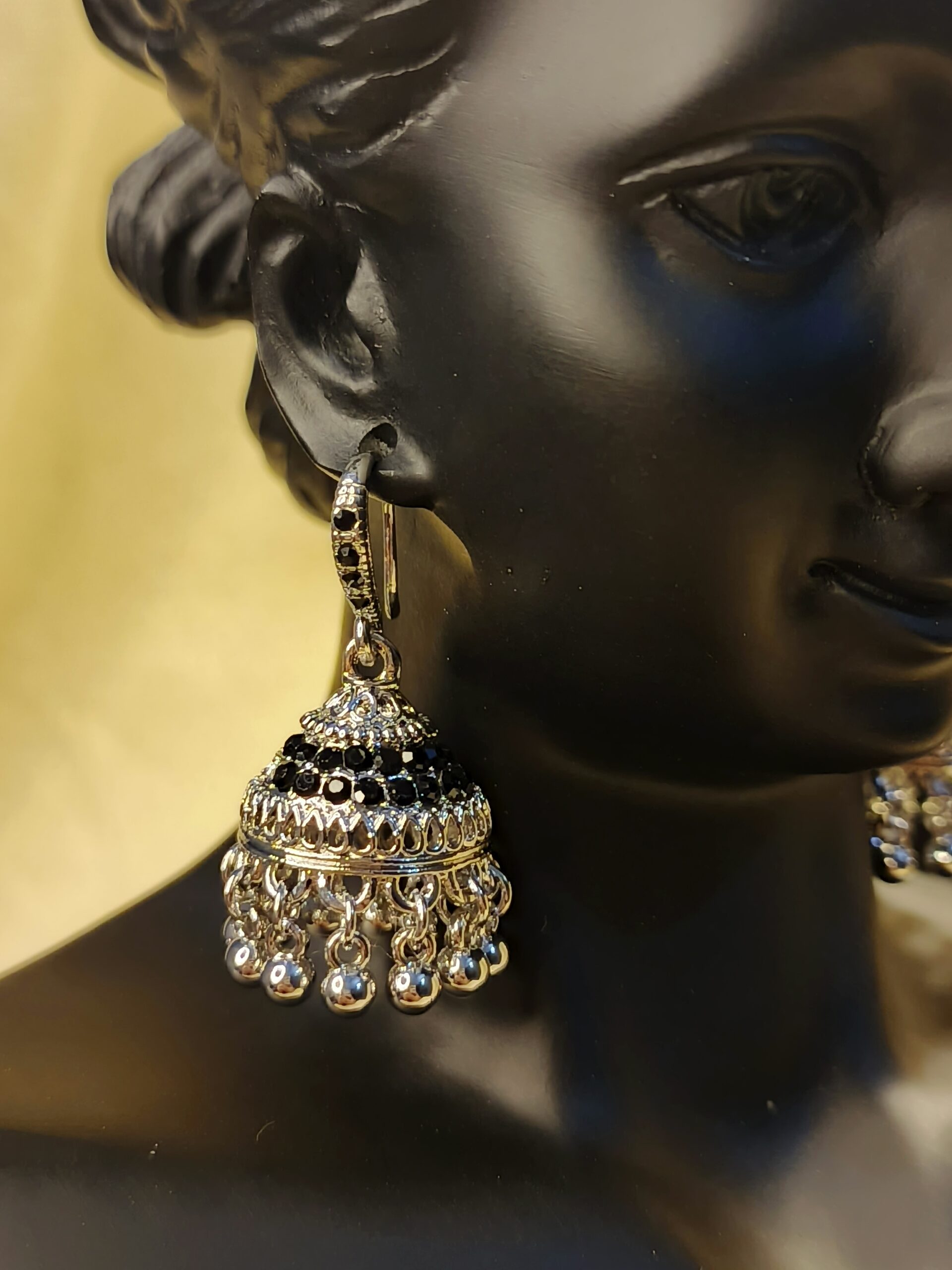 Enhance your jewelry collection with these Timeless Silver Jhumka Earrings, a true symbol of elegance and heritage. Crafted with intricate filigree detailing, these earrings feature a dome-shaped design embellished with dazzling black stones, adding a striking contrast to the polished silver finish. The delicate hanging bells (ghungroos) create a subtle jingle, making them a perfect accessory for festive occasions, weddings, or traditional attire.